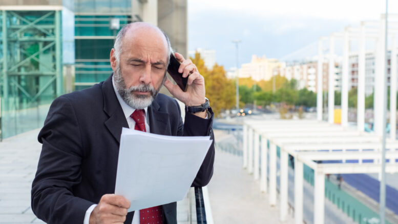 Focused serious mature business leader discussing contract on cellphone. Elderly man in formal suit and tie standing outside in city. Business phone talk concept